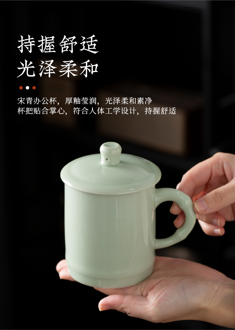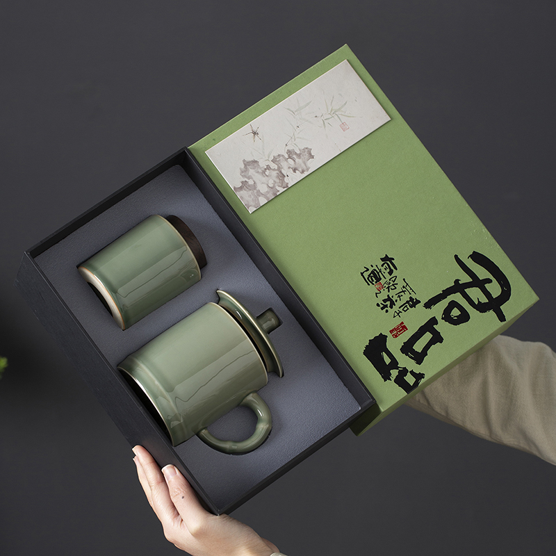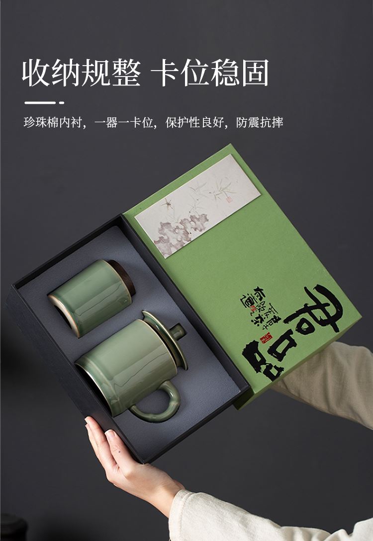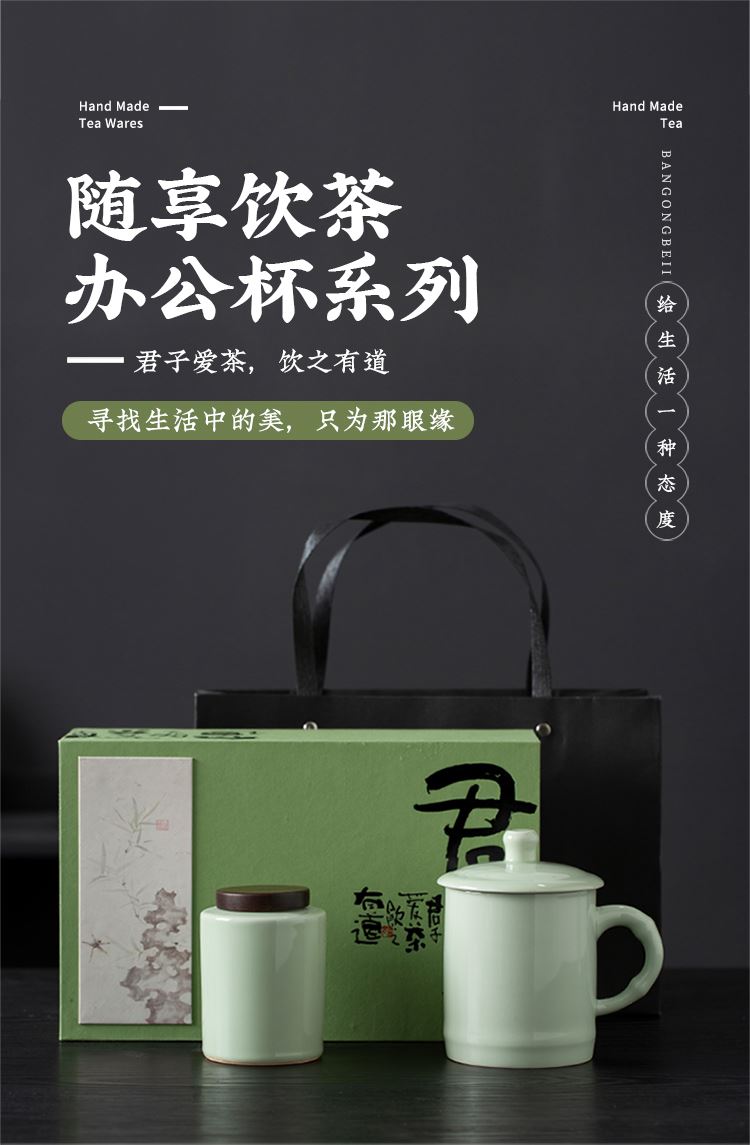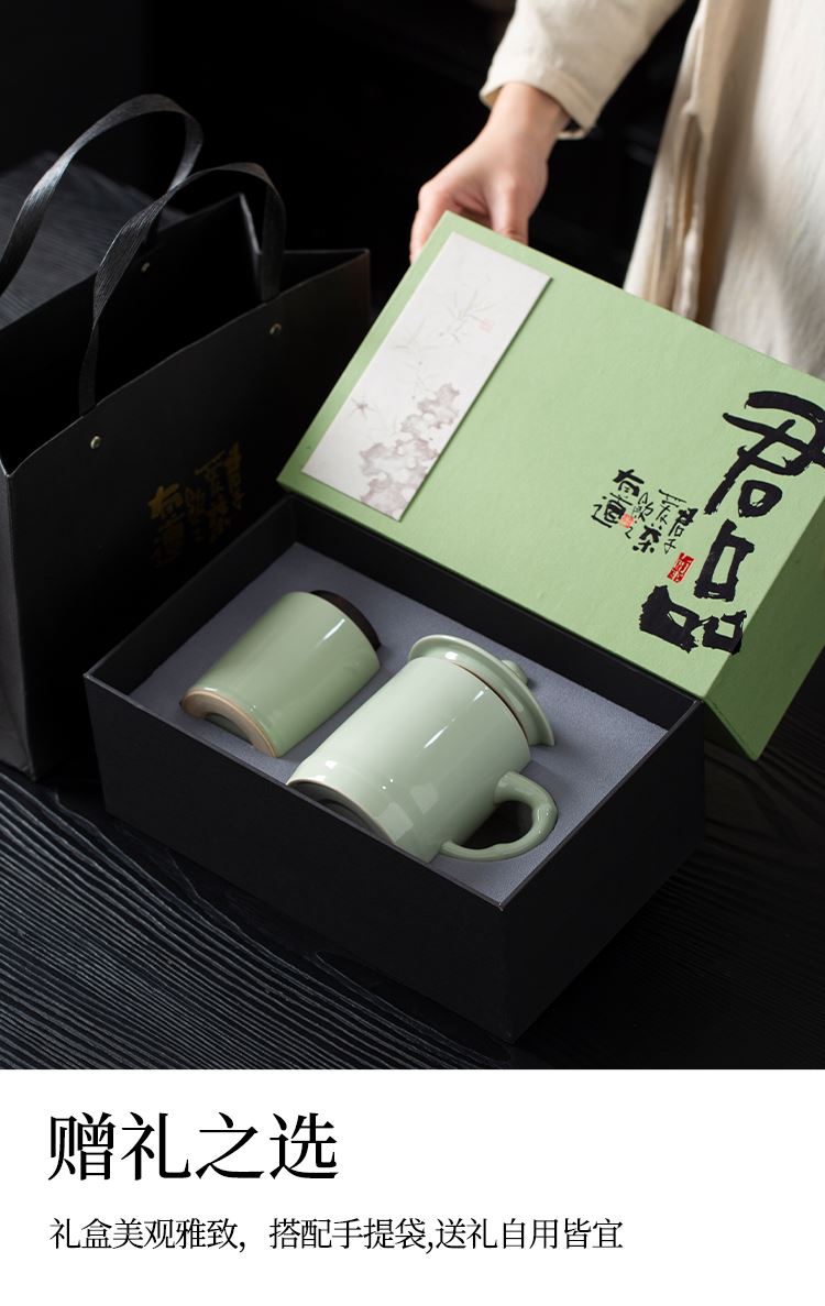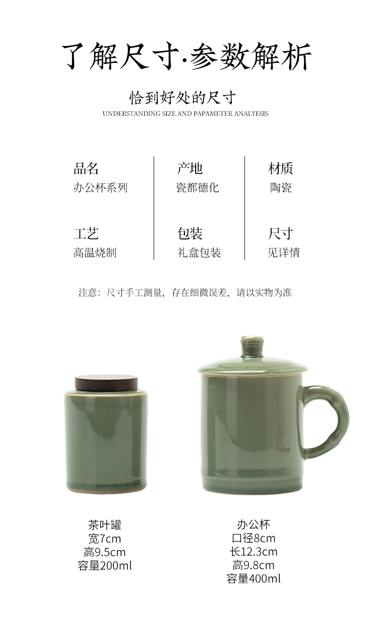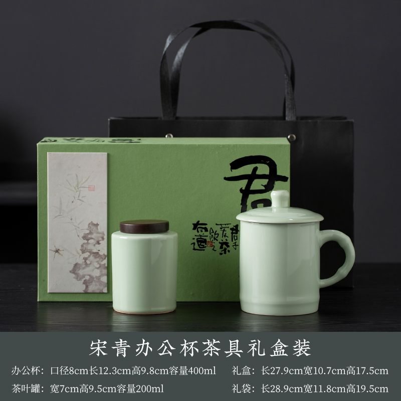 配置:办公杯*1 茶叶罐*1 礼盒*1 手提袋*1 材质:青瓷 礼盒尺寸:27.8cm*17.5cm*10cm 产品尺寸:办公杯:宽8cm/高12.3cm/容量:400ml 茶叶罐:宽7cm/高9.5cm/容量:200ml